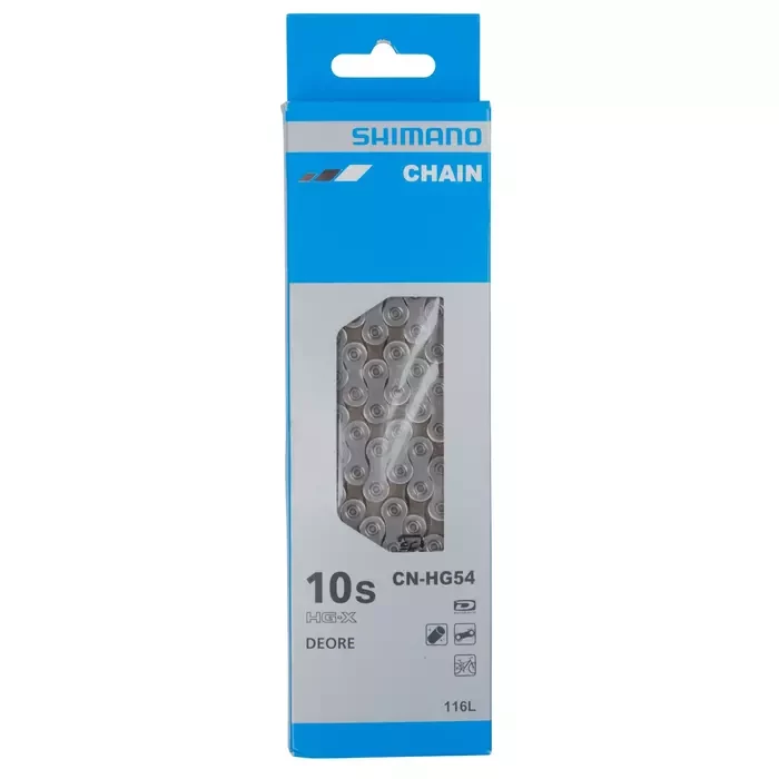 Chaine Shimano Deore HG54 10 vitesses. Pour transmissions Shimano et Sram. Chaîne avec 116 maillons et vendue avec attache rapide.